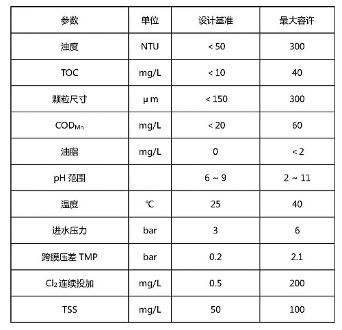 為了維持超濾膜性能的穩(wěn)定,尤其是保持超濾膜透水速率的相對(duì)穩(wěn)定,需要對(duì)超濾膜進(jìn)水水質(zhì)進(jìn)行限定或考慮適當(dāng)?shù)念A(yù)處理,以避免這些雜質(zhì)含量過(guò)高而對(duì)超濾膜組件造成嚴(yán)重的膜污染。超濾膜的設(shè)計(jì)是基于如下表中所示的合格進(jìn)水條件,但超濾膜可以短時(shí)間內(nèi)承受最大允許進(jìn)水水質(zhì)。