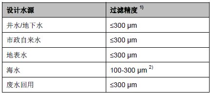 注:1)實(shí)際項(xiàng)目的過(guò)濾精度根據(jù)具體水質(zhì)條件和項(xiàng)目的具體要求確定;